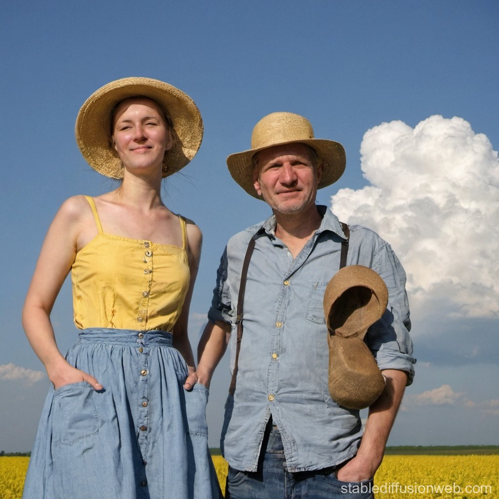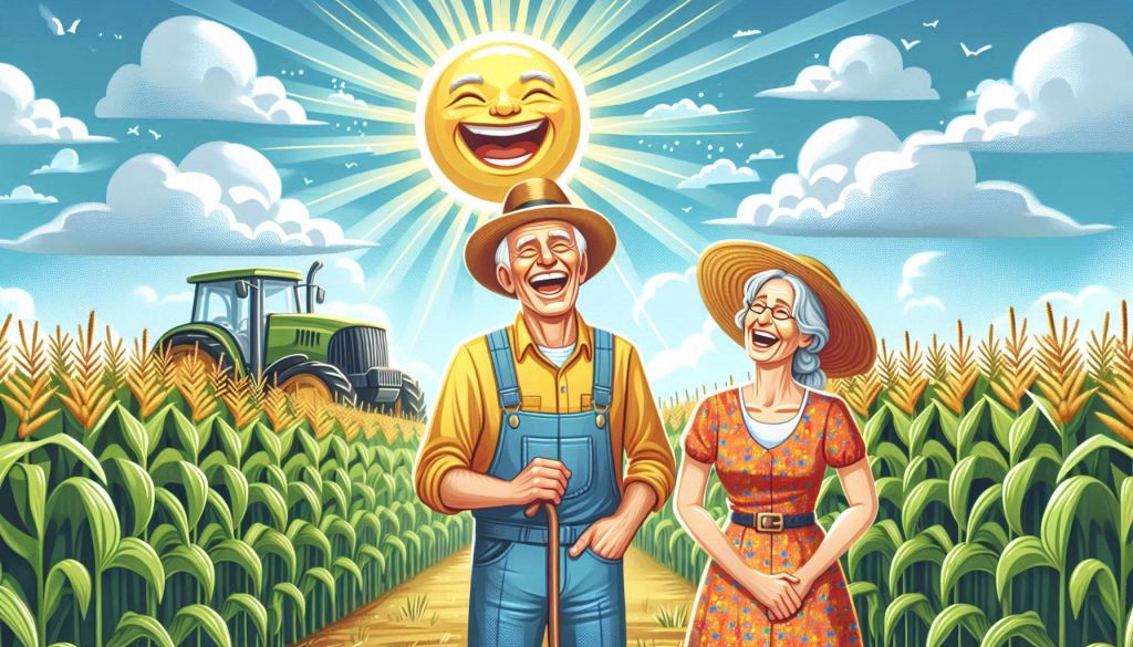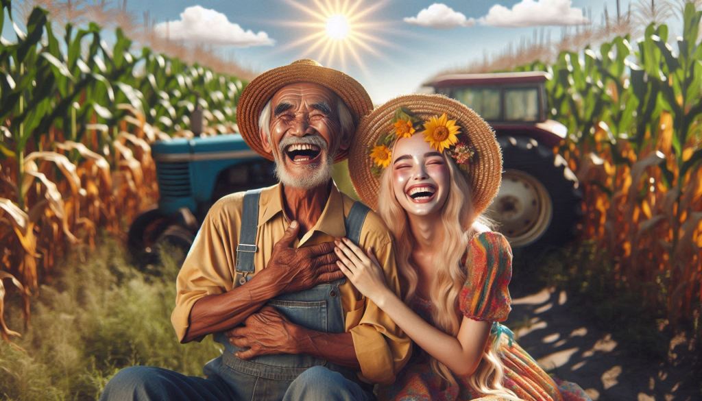 vom Himmel lachende Sonne, kleine Wolken, ein älterer Mann mit Hut in einem gelben Hemd und einer Jean, daneben eine jüngere Frau in einem bunten Kleid, in einem Getreidefeld, im Hintergrund ein Traktor