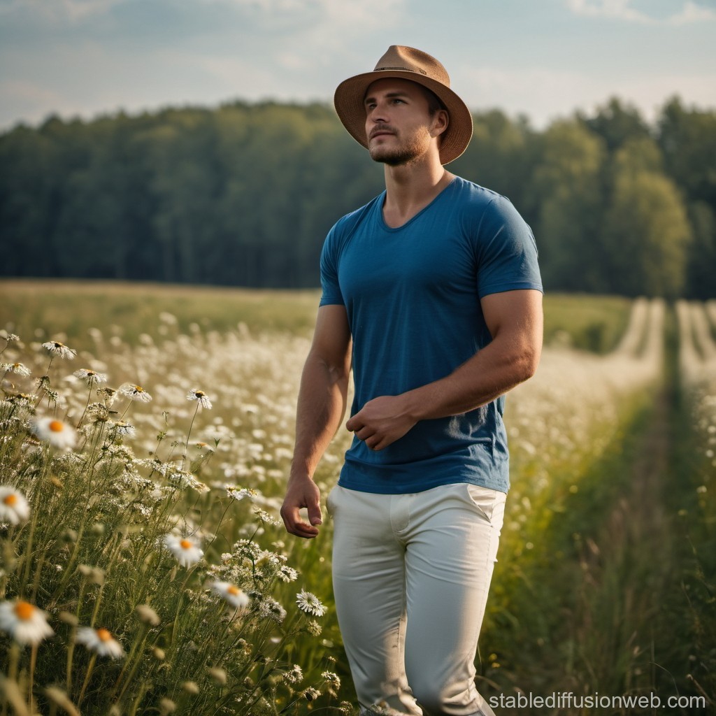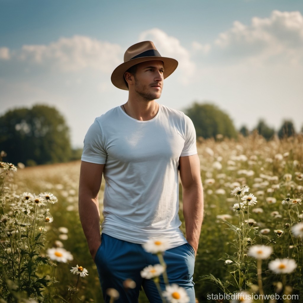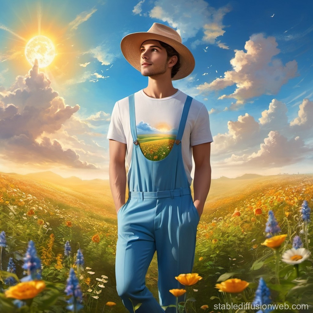 blauer Himmel, Wiese mit Blumen, Mann mit Hut, T-Shirt und Hose