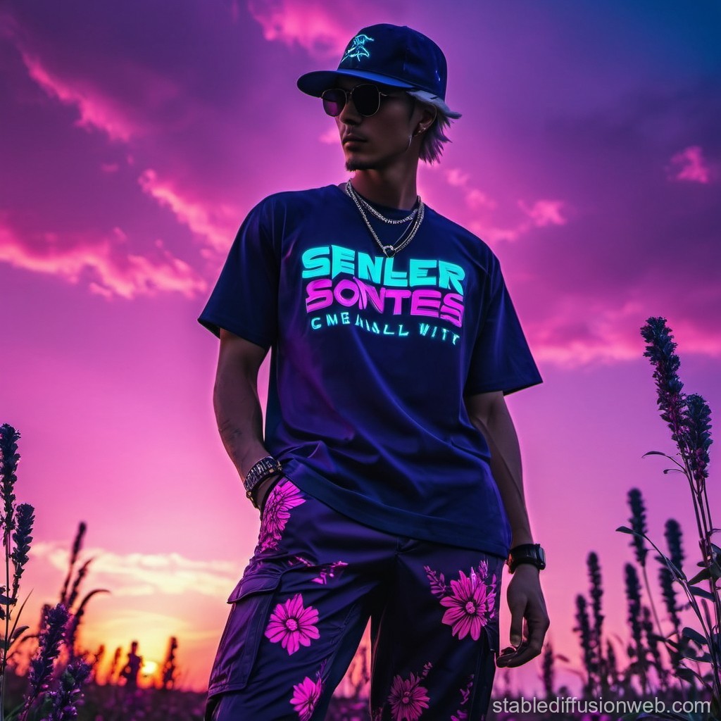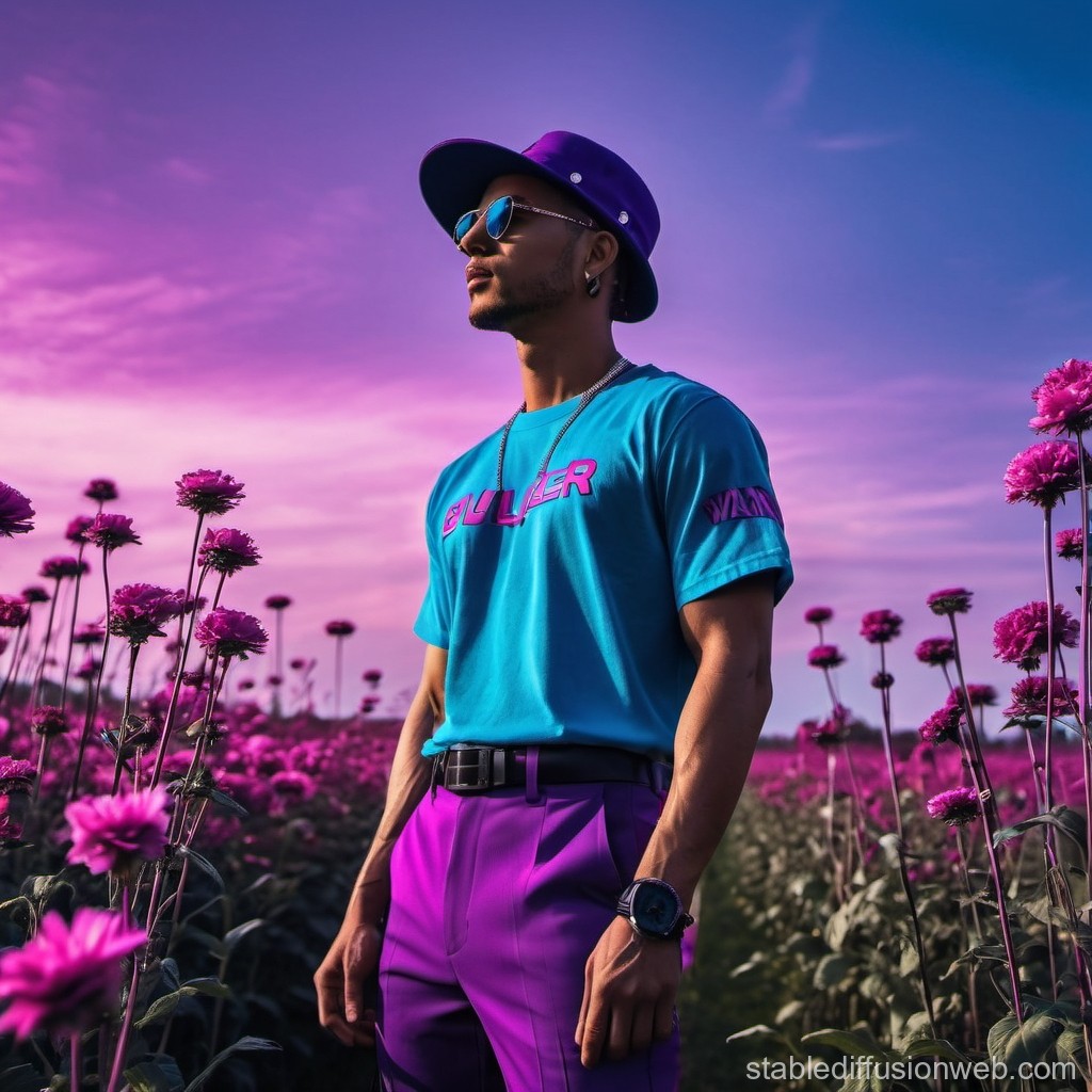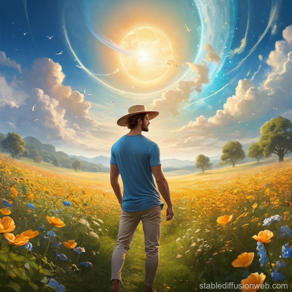 blauer Himmel, Wiese mit Blumen, Mann mit Hut, T-Shirt und Hose