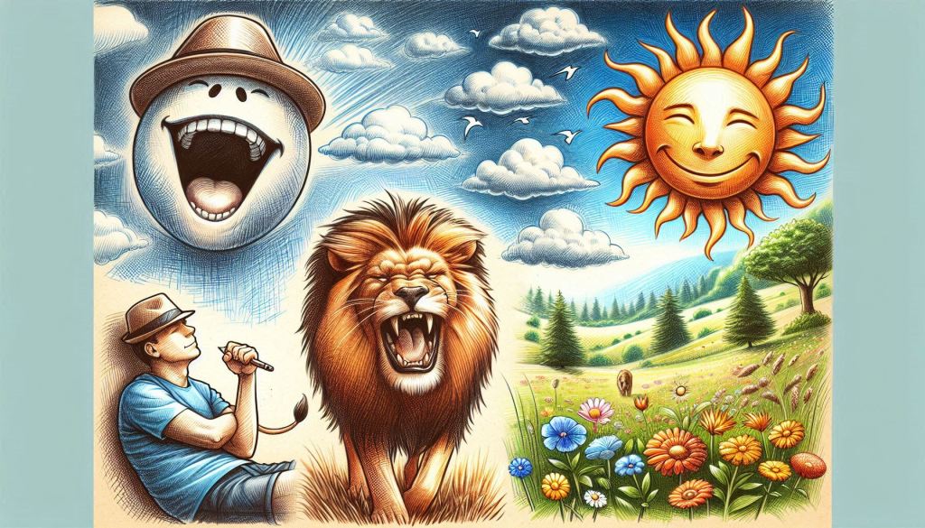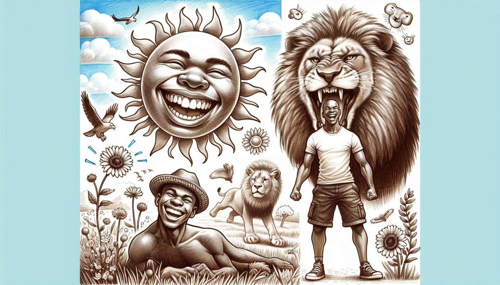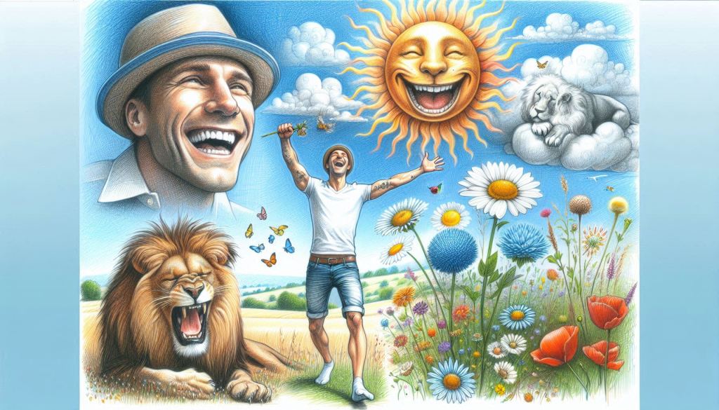 Zeichnung: lachende Sonne, blauer Himmel, Wiese mit Blumen, brüllender Löwe, Mann mit Hut, T-Shirt und kurzer Hose