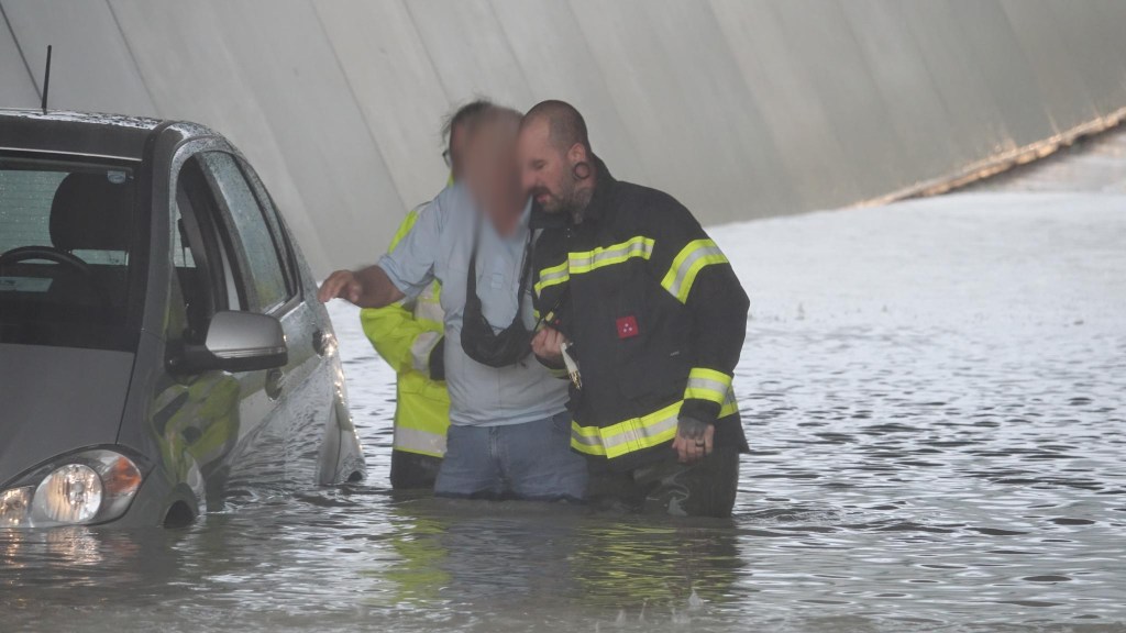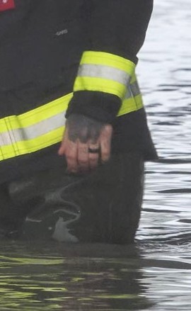 Der Helfer (vernehmlich ein Mitglied der Freiwilligen Feuerwehr) trägt deutlich sichtbar einen großen Ohrschmuck und auf der Hand und am Hals sind Tätowierungen zu sehen.