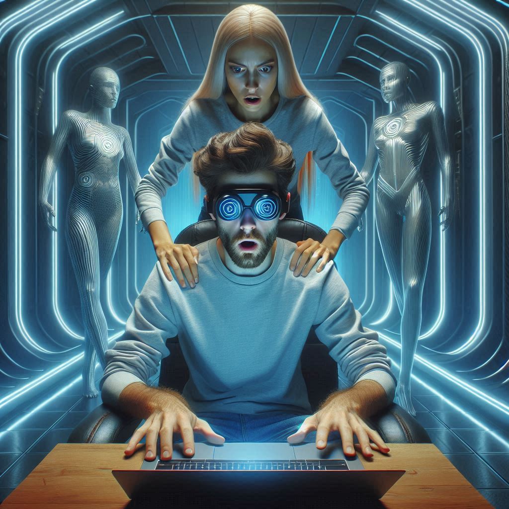 In einem futuristisch aussehenden Raum: Ein Mann sitzt mit erstauntem Blick vor dem Laptop, hinter dem Mann steht eine Frau und legte ihre Hände auf seine Schultern.