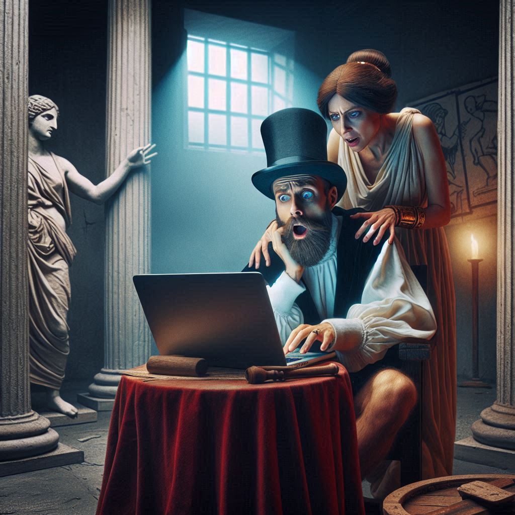 In einem spartanisch eingerichteten Raum: Ein Mann sitzt mit erstauntem Blick vor dem Laptop, der Mann trägt einen Zylinder am Kopf, hinter dem Mann steht eine Frau in einem Kleid und legte ihre Hände auf seine Schultern.
