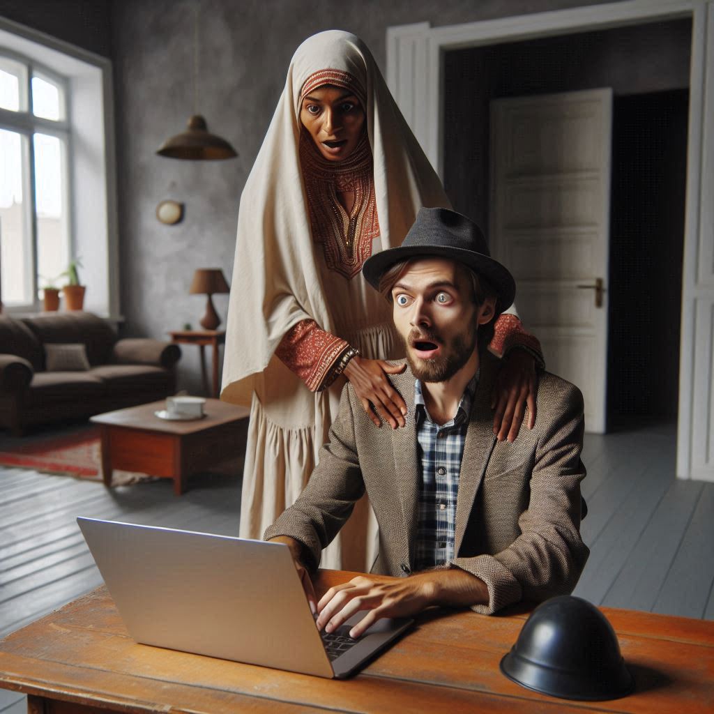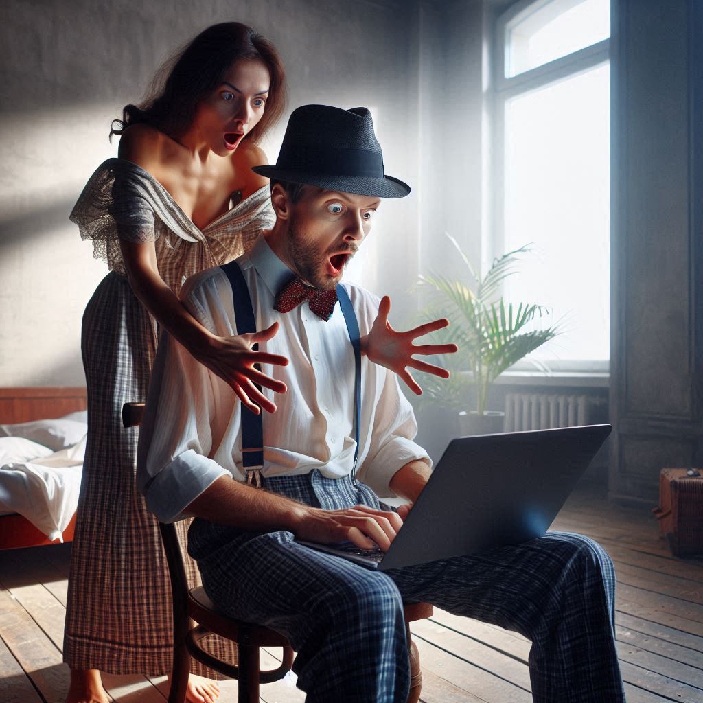In einem karg eingerichteten Raum: Ein Mann sitzt mit erstauntem Blick vor dem Laptop, der Mann trägt einen Hut am Kopf, hinter dem Mann steht eine Frau in einem Kleid und legte ihre Hände auf seine Schultern.