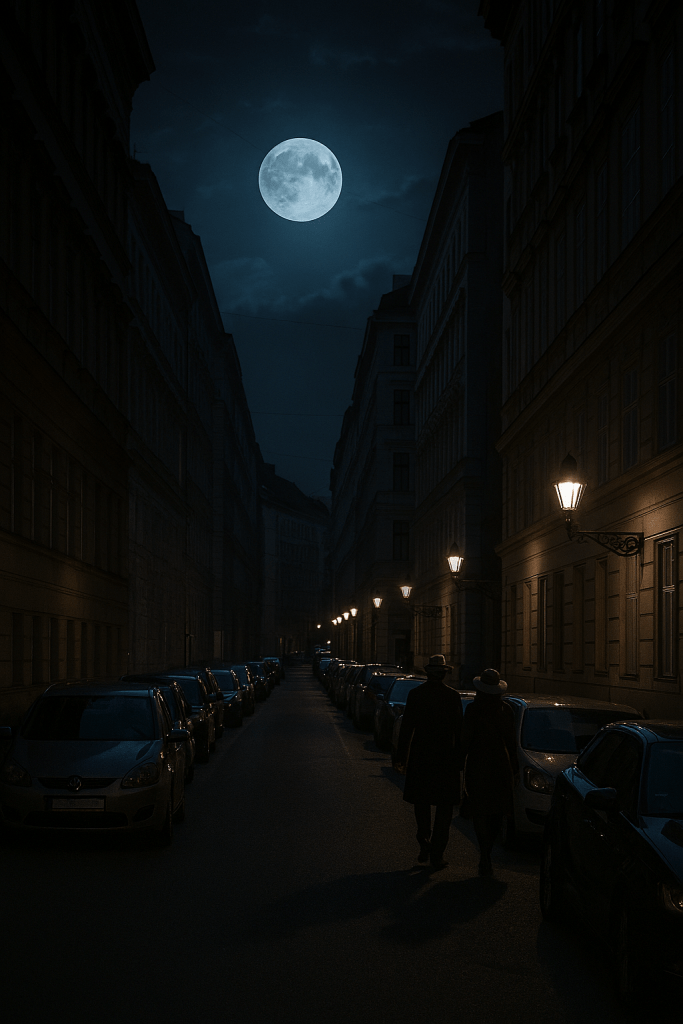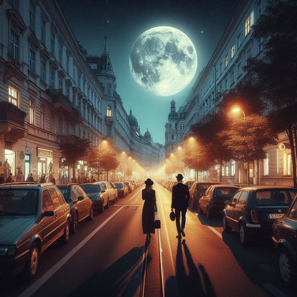 Eine Straße in Wien in der Nacht, Vollmond, parkende Autos neben der Straße, am Gehweg geht ein Paar mit Hut.