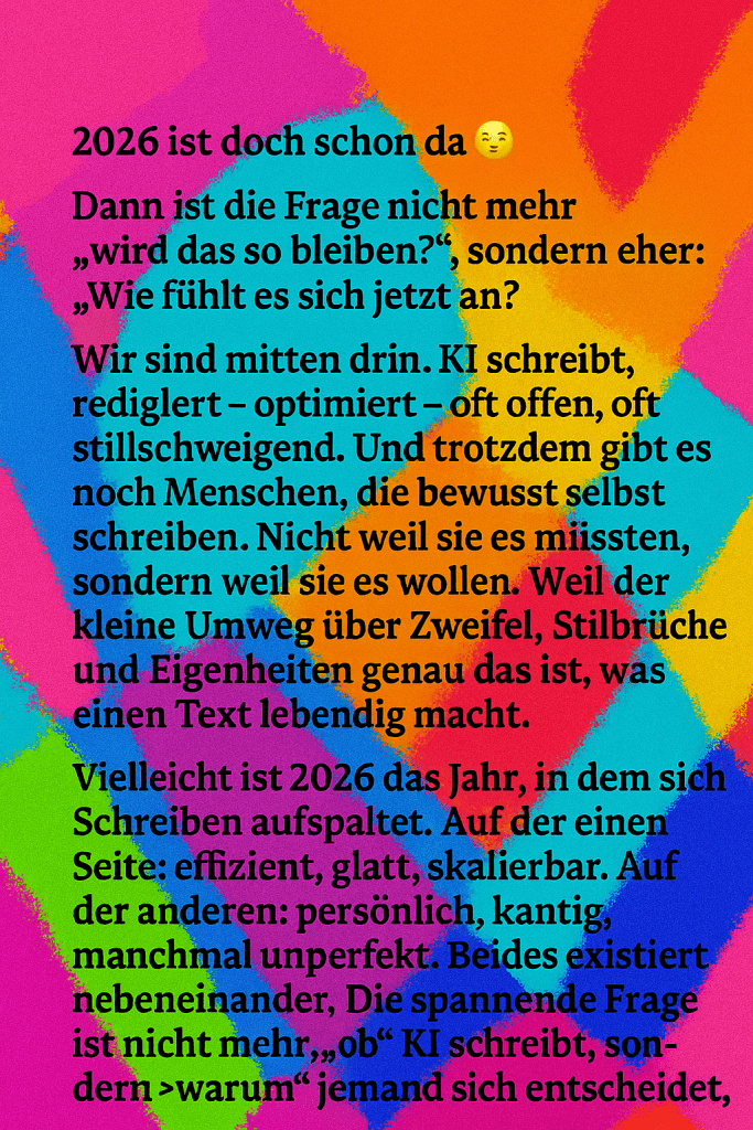 Vielleicht ist 2026 das Jahr, in dem sich Schreiben aufspaltet. Auf der einen Seite: effizient, glatt, skalierbar. Auf der anderen: persönlich, kantig, manchmal unperfekt. Beides existiert nebeneinander. Die spannende Frage ist nicht mehr, ob KI schreibt, sondern warum jemand sich entscheidet, es selbst zu tun.
