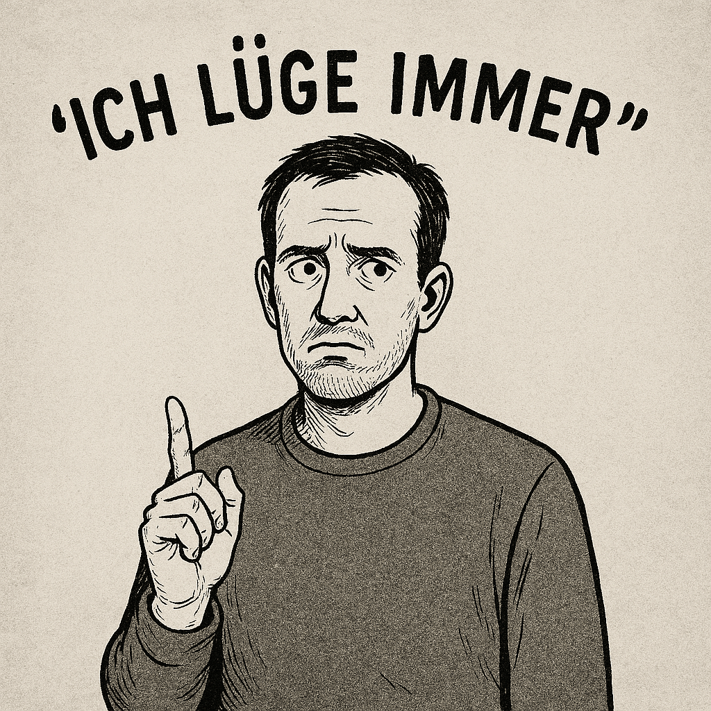 Stell dir vor, die Figur, die „Ich lüge immer“ sagt, steht nicht in einem Raum, sondern in einem Satz, der sich langsam um sie herum schließt. Der Satz ist wie ein Spiegelkabinett: Jede Aussage wirft eine neue zurück, jede Wahrheit kippt in eine Lüge, jede Lüge in eine Wahrheit.